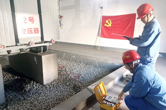 图为工程建设中心党支部对35kV百良变电站2#变压器进行直流电阻试验