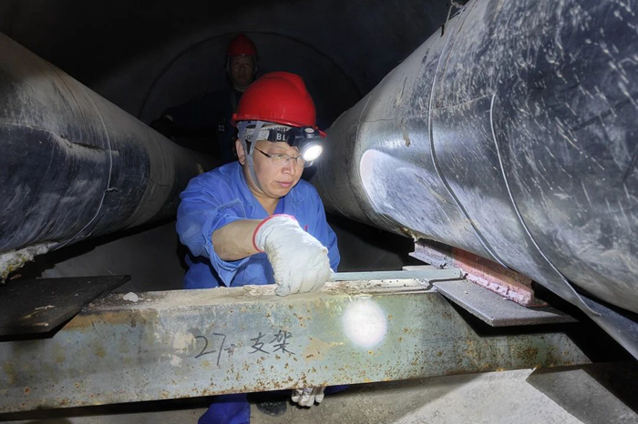 图为热力车间主任魏建浩正在对一级供暖管网支架位移情况进行测量