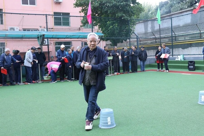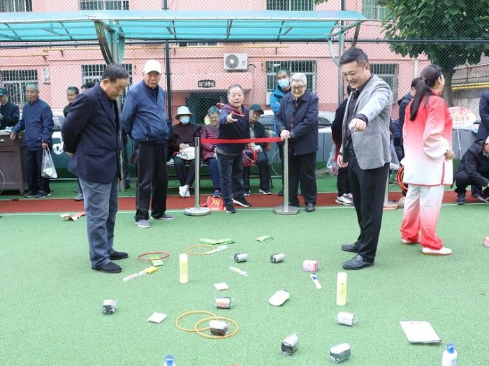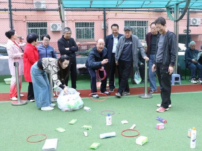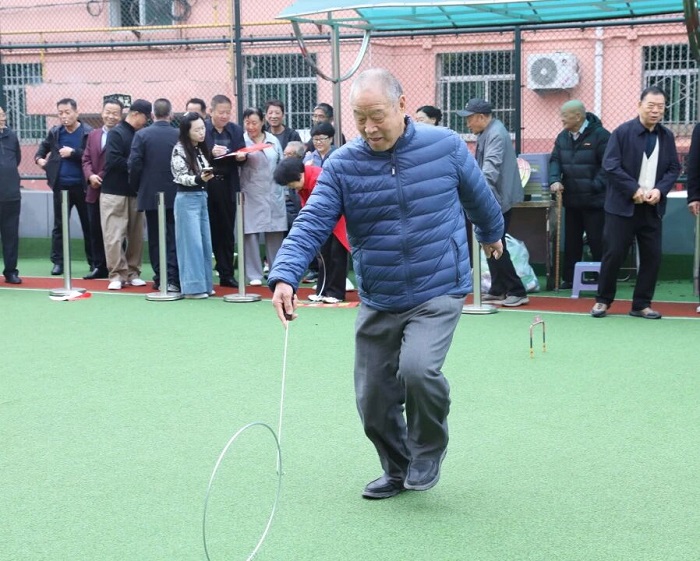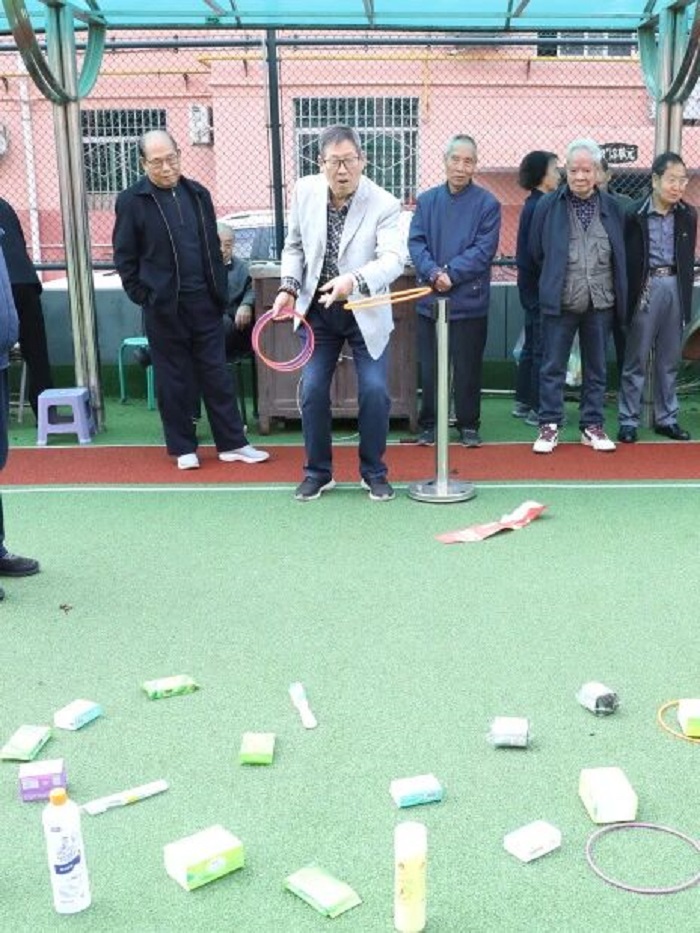 最吸引人的还得是压轴的“套圈儿”,这也是老同志们最喜爱的游戏。牙膏、水杯、肥皂……场地上,琳琅满目的小礼品宛如幸福的队列,静静等待着被“圈中”的幸运时刻,看得大家心里发痒。老同志们眯起眼睛,轻轻一掷,彩色圆圈便在空中划出一道优美的弧线,稳稳地套中目标。每一次成功套中,都引来现场阵阵欢呼。