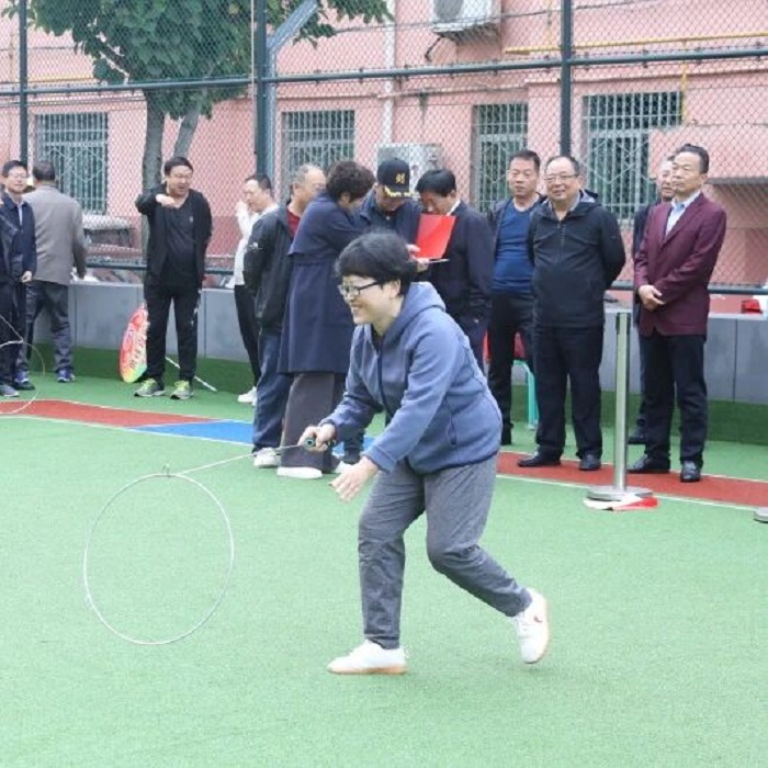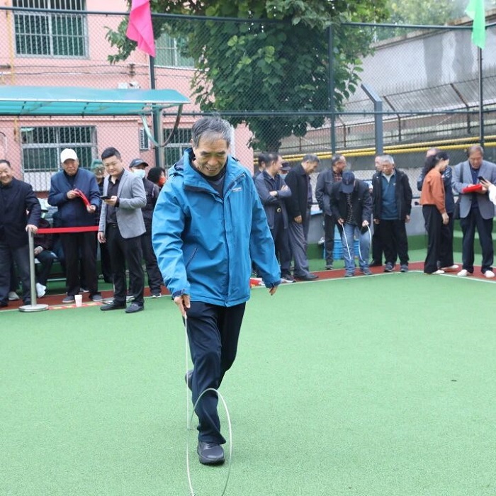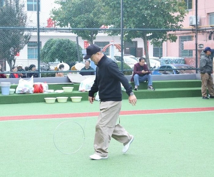 紧接着登场的“滚铁环”,直接把怀旧感拉满!看,老同志们握着铁钩轻轻一甩,圆圆的铁环便在阳光下欢快地滚动起来。老同志们弓着腰跟着小跑,步伐虽已不复年轻时的矫健,但那份专注与执着,却令人由衷地敬佩。他们一边奔跑一边调整角度,每一步都充满了对青春的怀念和对现在幸福生活的珍惜。