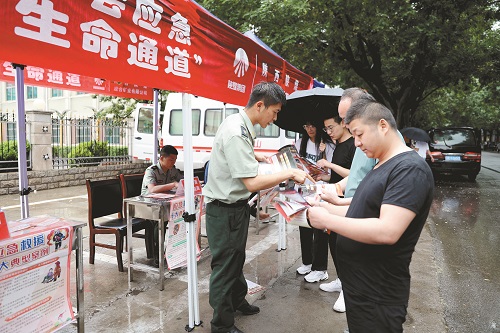 图为在公司直属机关办公楼前,救护大队志愿者耐心细致地为职工及家属提供应急救援、消防安全等方面内容的咨询及普及。